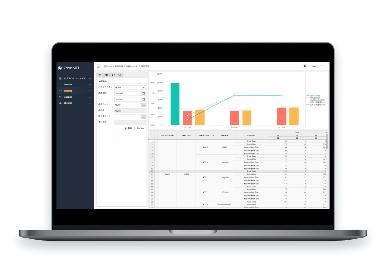 戦略品目や重点管理品目について、目標予算とのギャップや利益率を数量と金額で評価しながら将来の販売見込みを集計・調整します。