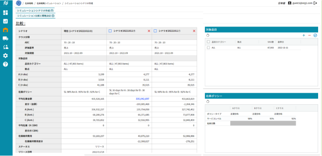 ABC分類、サービスレベル、在庫日数等を調整して比較検討が可能です。